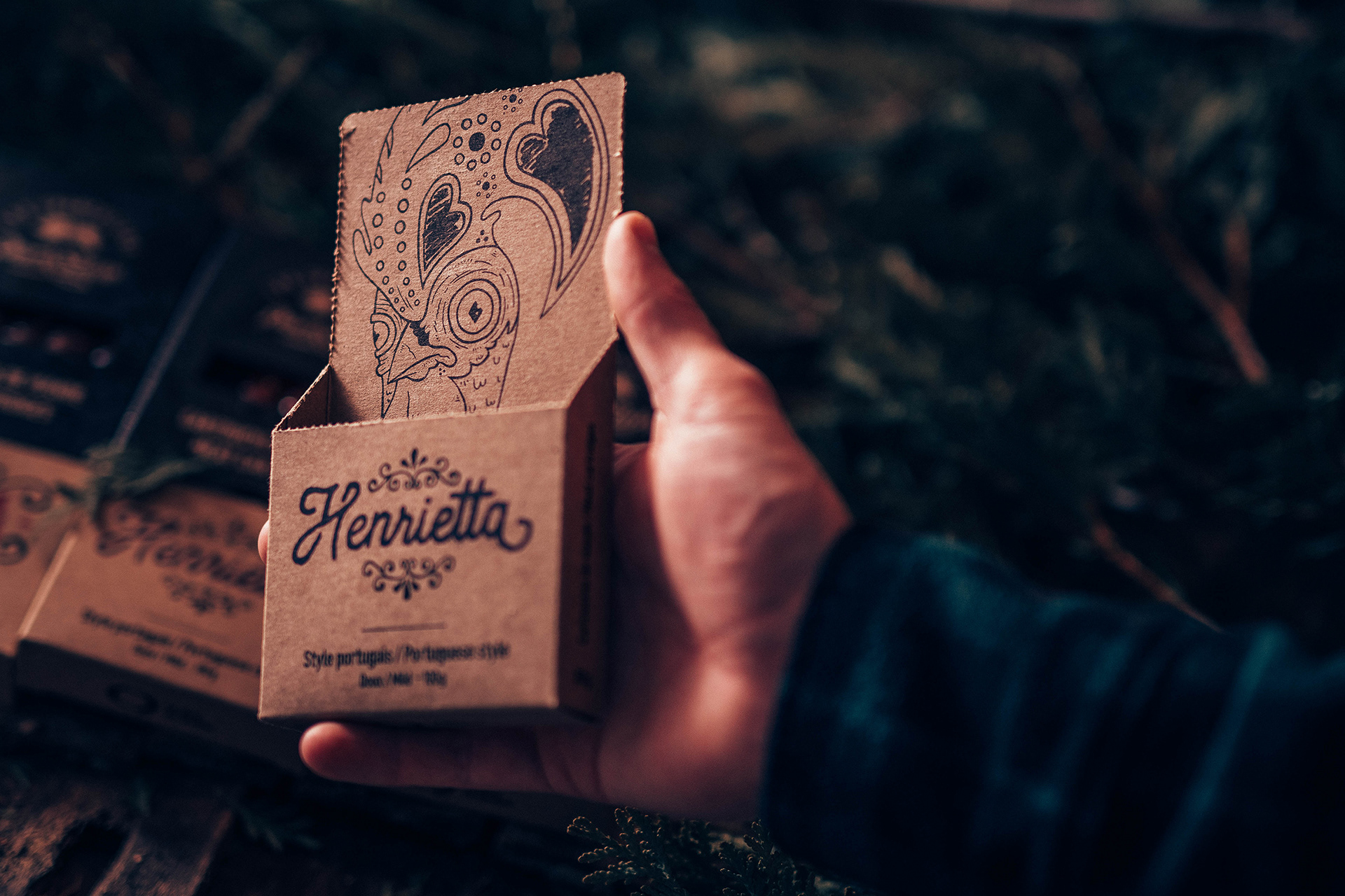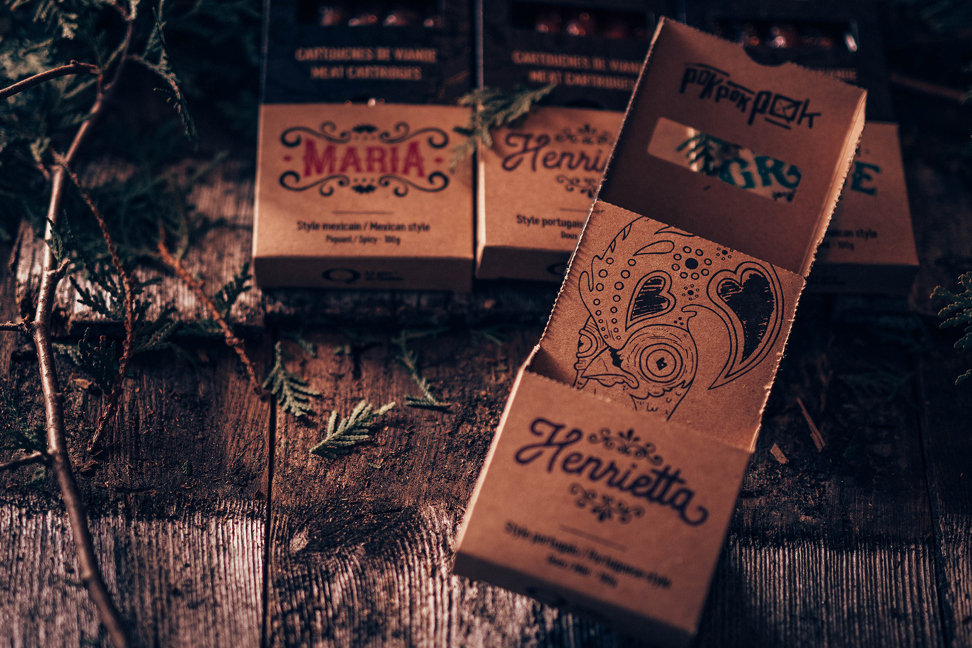 Conception d'une maquette de boîte pour habiller les 3 nouveaux produits des Charcutiers Pork Shop. Création du design graphique, du nom ainsi que du thème pour chaque saveur. L'illustration du Maria et des noms sont de moi tandis que Henrietta est de Jean-Simon Nolet et Grace de Félix Laflamme.