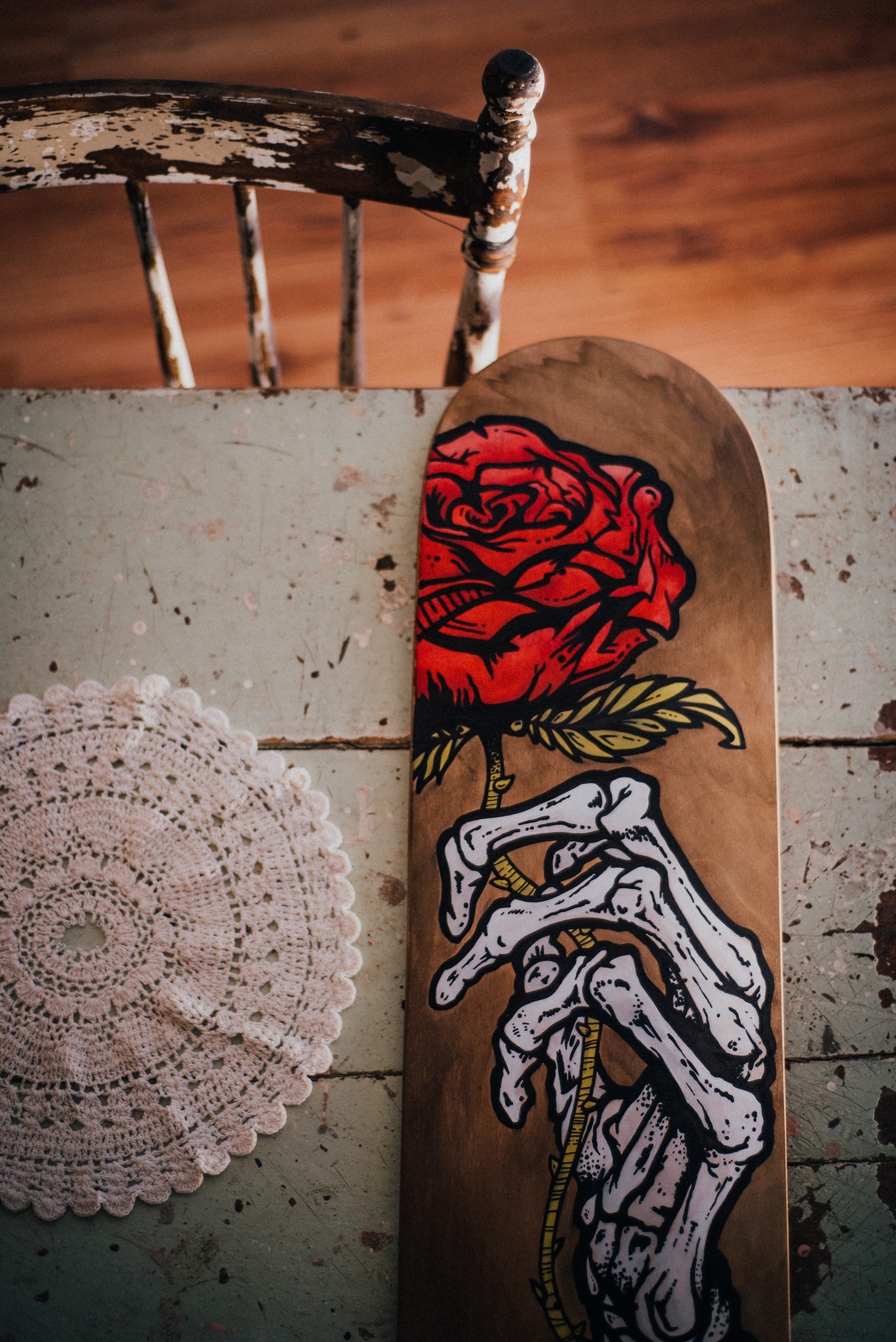 SMILE & DESTROY | Acrylique & Posca sur une planche faite sur mesure par Village Skateboard présentée lors de l'exposition Mongo au Café Lewis. | Février 2023
